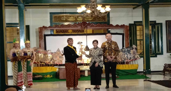 Menteri Komunikasi dan Digital (Menkomdigi), Meutya Hafid berpose bersama KGPAA Mangkunegara X dan dalang wayang kulit dalam pagelaran seni bertajuk Mangkunegaran Natyapura di Dalem Prangwedanan, Mangkunegaran Solo, Sabtu (04/10/2025) malam. (Foto: Dok. solotrust.com/Andy Battosai)